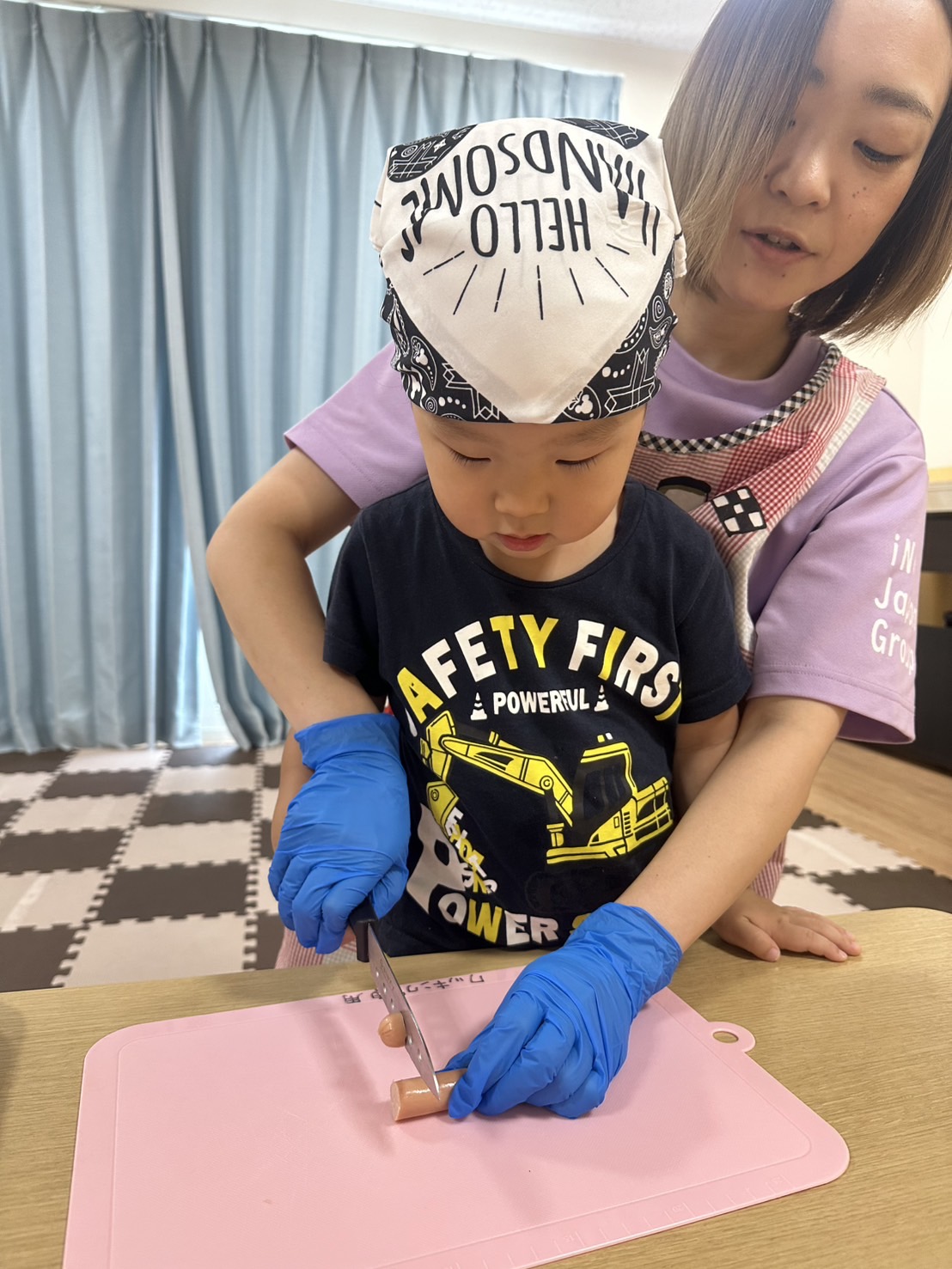 包丁や型抜きを使う前後ではニコニコしていましたが、いざ自分の順番が来るとみんな真剣な表情で取り組みとてもかっこいい姿を見せてくれました💕