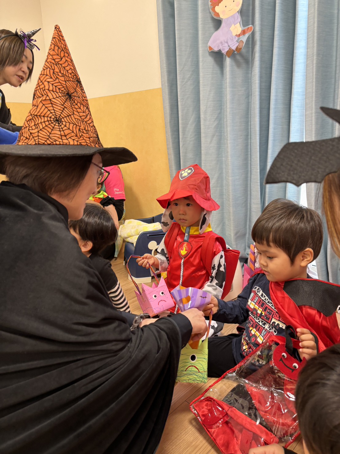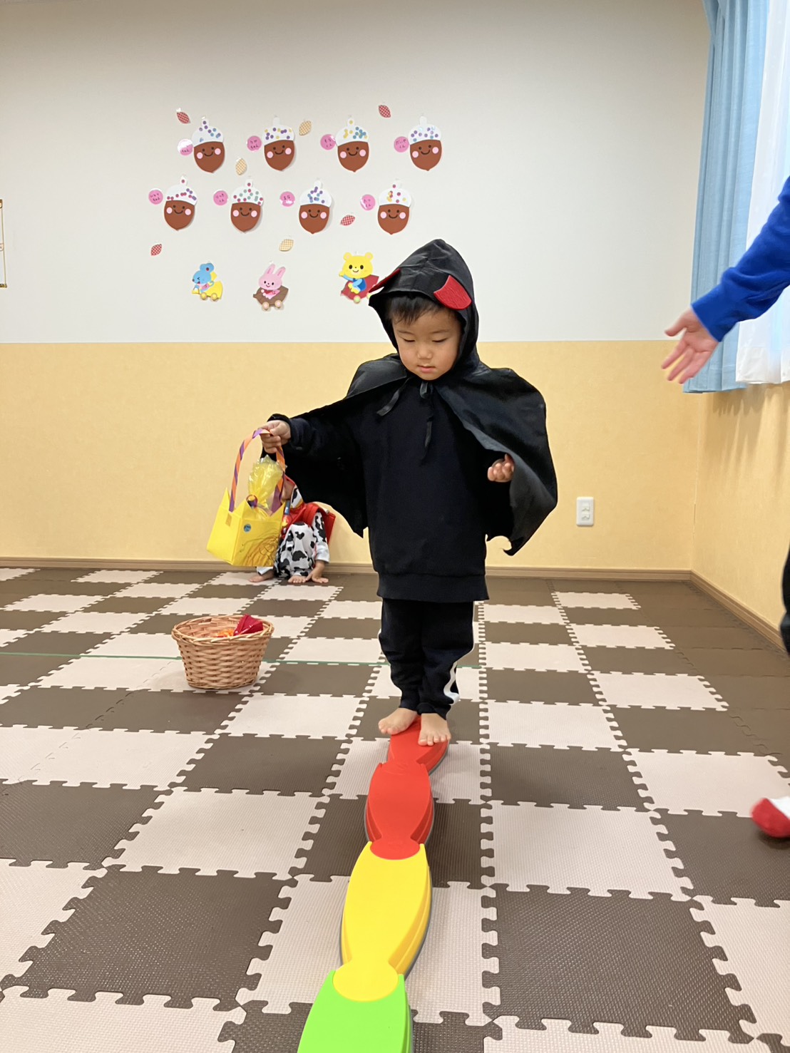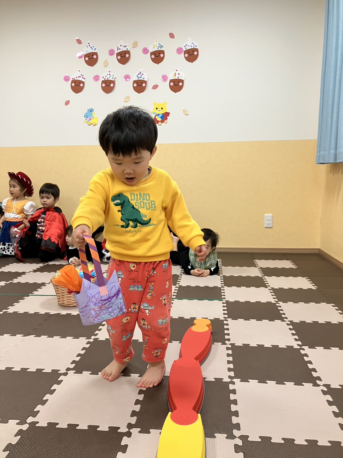 ゲームではハロウィンにちなんで好きな色のキャンディーを運んで同じ色のカゴに入れるというものでした✨カゴにたどり着くまでには平均台があったりジャンプしてタンバリンを叩くなどの道のりがありましたが、みんな真剣に参加していました😊