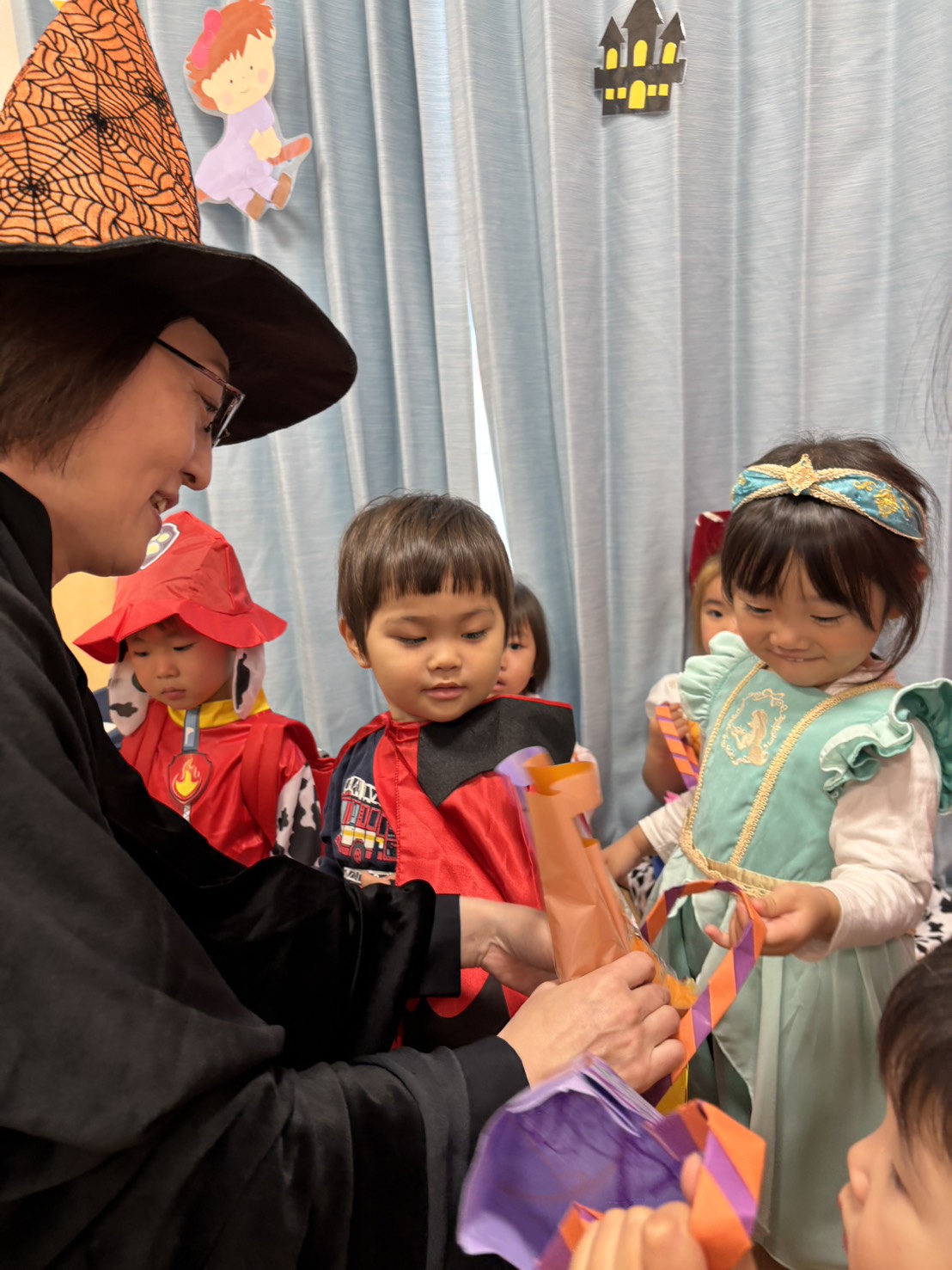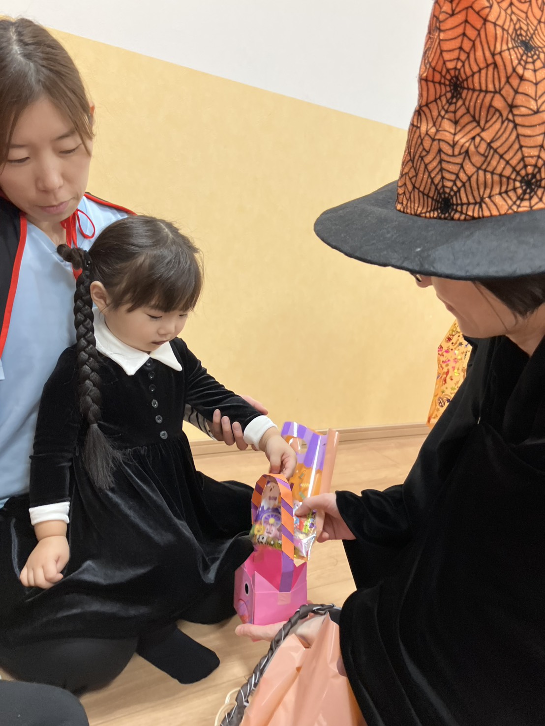全員がゴールした後に魔女役の保育士がやってくると固まる子どもたち💦でもお菓子をくれると分かるとにっこにこで嬉しそうでしたよ💕分かりやすい表情の変化が可愛すぎました😂